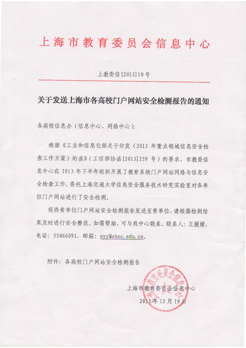 在市教委信息中心组织的2013年下半年教育系统门户网站网络与信息安全检查工作中,学院、市农校顺利通过检测,风险等级为“低”。