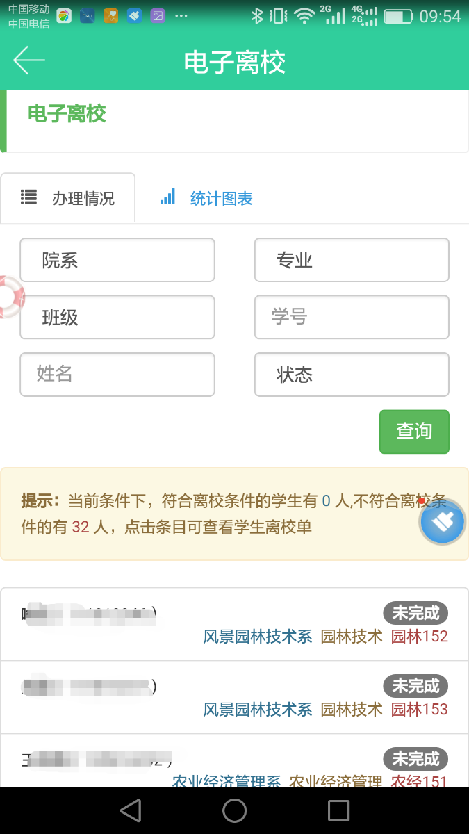 各职能部门登录电脑端离校系统来审核各个离校项目,各部门按照自己的不同权限,共同完成毕业生离校手续的办理,办结的离校数据反馈在系统中。师生均可以通过电脑端和手机端查看离校手续办理情况。学生通过离校系统自助服务能清楚哪些项目已经完成办理、哪些项目还需办理,包括办理时间、地点、如何办理手续等信息都能查看到。教师通过电脑端离校系统或者“i尚农”中“电子离校”可查看办理情况,可以按照院系、专业、班级、学号、状态等组合来查询学生离校手续办理情况,还可以通过统计图表来看各系办理离校情况的柱状图和百分比,而且数据实时更新。