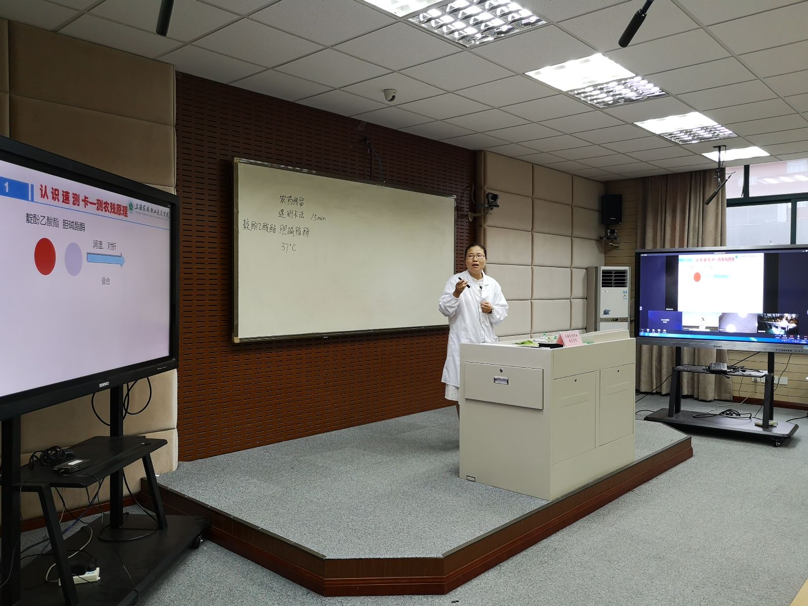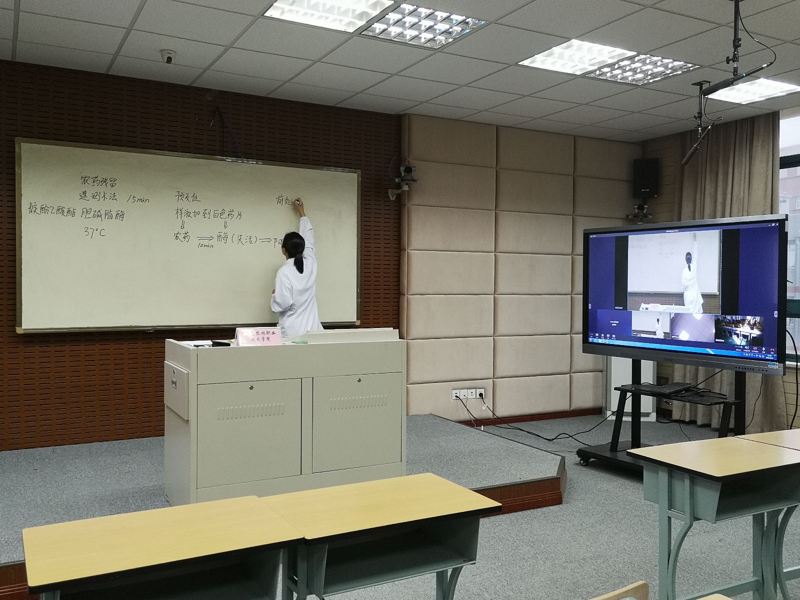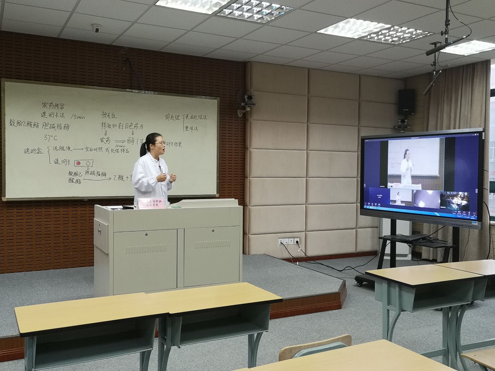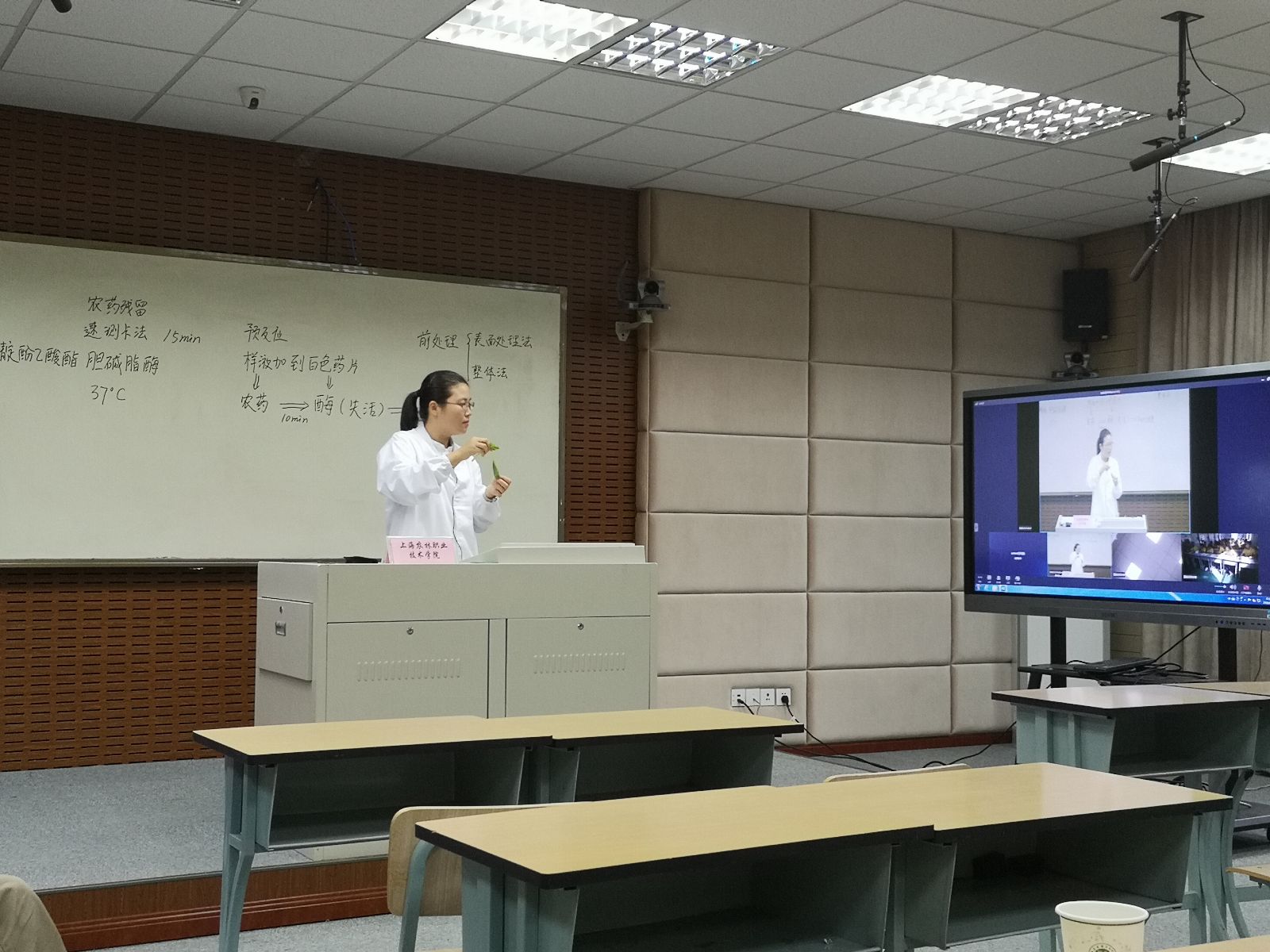 这次所授课程是援疆专业——农产品贮藏与保鲜专业的课程之一,授课主要内容为“速测卡法测定蔬菜中的农药残留”,分为样品前处理、加样、预反应和速测卡反应等步骤,范老师通过理论讲解、现场演示和远程互动等方式为远在新疆的学生实时授课。通过远程实时交互的视频会议系统,进行远程授课,实现了相隔千里的信息化实时授课学习。这是自2016年学院开展援疆工作以来,新的援疆形式。