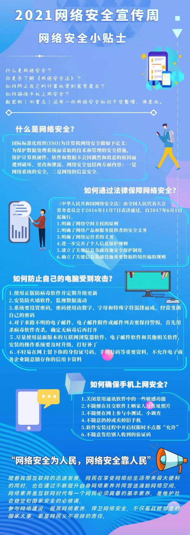 “没有网络安全就没有国家安全,就没有经济社会稳定运行,广大人民群众利益也难以得到保障。”习近平总书记高度重视国家网络安全工作,在不同场合多次就网络安全发表重要论述,为筑牢国家网络安全屏障、推进网络强国建设提供了根本遵循。网络空间是大家共同的精神家园,“网络安全为人民,网络安全靠人民”,希望大家积极参与我校国家网络安全宣传周活动,提高网络安全防护水平,让我们的校园网络生活更安全、更正能量。