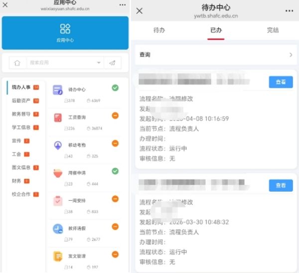 “应用中心”包含了“院办人事”、“后勤资产”、“教务督导”、“学工信息”等类别,点击相应类别,即可打开各流程应用,办理相关业务。“待办中心”可以查看各项业务流程的办理进度。