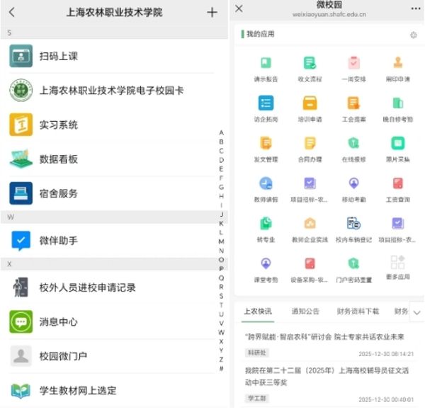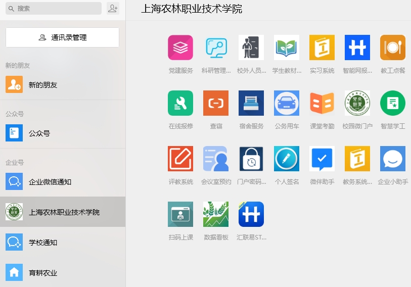 关注后,在微信的通讯录里找到“上海农林职业技术学院”,进入学校企业微信。
